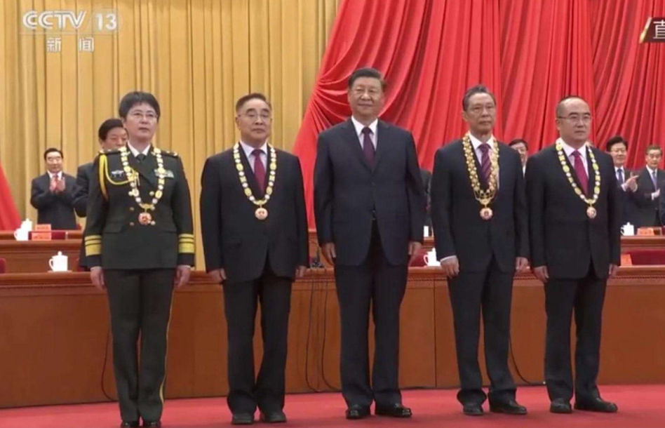 在全場熱烈的掌聲中,在人們崇敬的目光注視下,4位國家勛章和國家榮譽(yù)稱號獲得者受邀到主席臺就座。